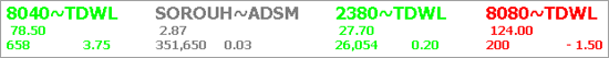 أيضا يعرض شريط الصفقات الرمز، السوق، سعر أخر صفقة والتغير في السعر بالمقارنة مع الإقفال السابق لجميع الأسهم التي قمت باختيارها من قائمة المتابعة، كما يعرض التفاصيل ذات الصلة للأسهم التي تتداول بأعلى من الإقفال السابق باللون الأخضر، والأسهم التي تتداول بأقل من الإقفال السابق باللون الأحمر و الأسهم التي تتداول بدون أي تغير مقارنة بالإقفال السابق تعرض باللون الرمادي.