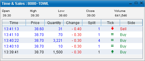 Time & Sales gives you all the Time & Sales details for a particular symbol when the market is open and displays trades that take place from the time you open the window.