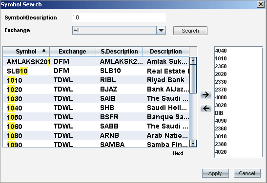 | 6. | Once you have finished selecting symbols, click on Apply. This includes all selected symbols in the Watch List. |