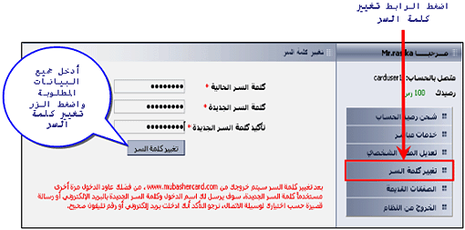 لتغيير كلمة سر حساب بطاقة مباشر : |